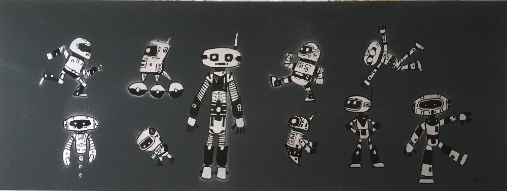 Dance party! March 28, 2017Doodlesindia ink, robots, silver, spray paintgog “I wouldn’t call that dancing” Spray paint & india ink on black cardboard 24.5 x 9.25 Share this: Click to share on X (Opens in new window) X Click to share on Facebook (Opens in new window) Facebook Like Loading... Related