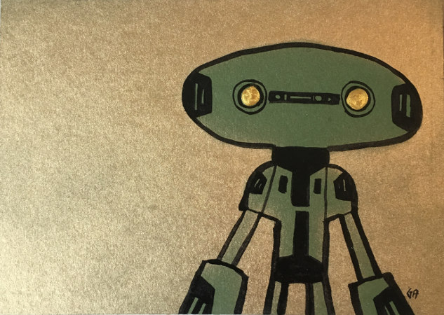 Over heating? May 19, 2017Doodlesalien, india ink, robots, spray paintgog “Just a little, it’ll all go away in a sec. Sure is hot in here” India ink, spray paint & nail polish on cardboard 11×14