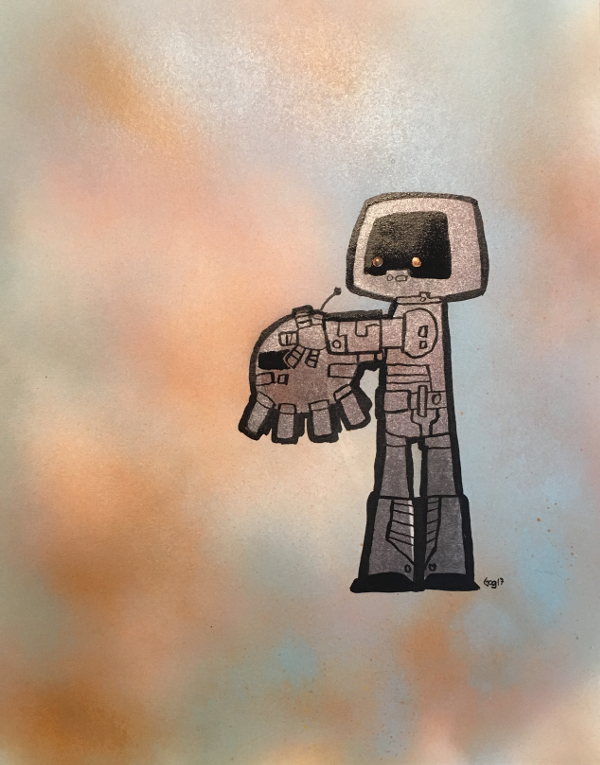 Query: Who’s a good boy? March 23, 2017Doodlesalien, india ink, nail polish, robot dog, robots, spacemen, spray paintgog “Answer: Unable to answer due to good being unquantifiable” India ink, spray paint & nail polish on white cardboard 11×14