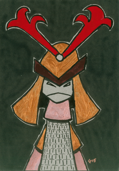 Hai January 18, 2016Doodlesalien, india ink, monsters, nail polishgog “Samurai desu” India ink & nail polish on grey cardboard 5×7