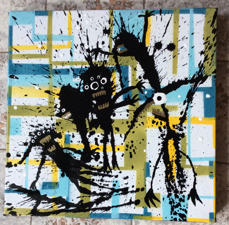 Acrylic paint, spray paint, india ink & nail polish on canvas