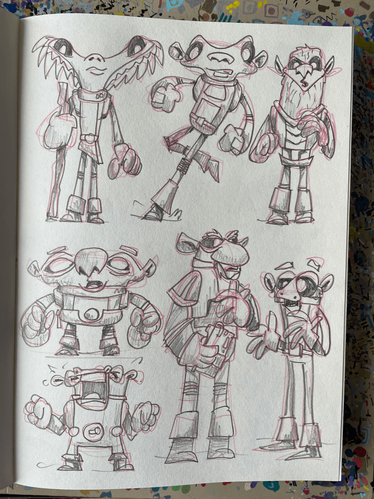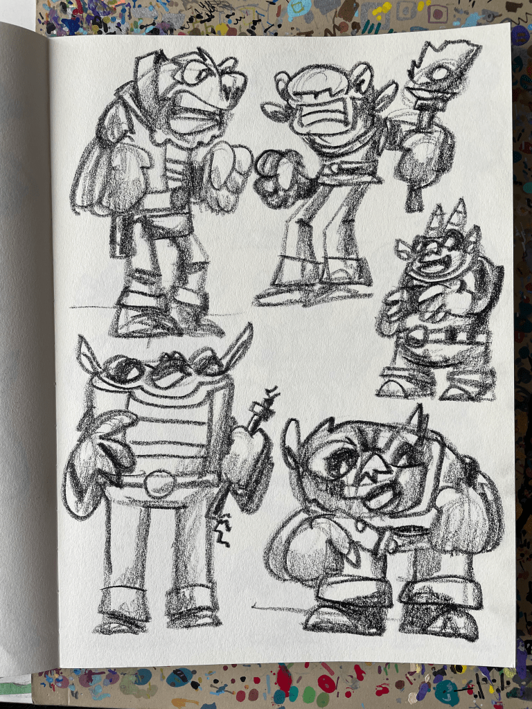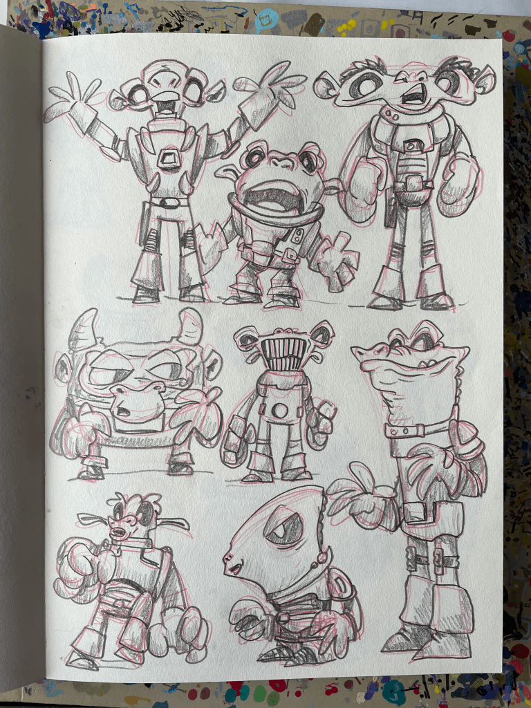 Space Critters Thick Sketchbook, part 6 December 13, 2022Doodlesaliens, blackwing, china markers, col-erase, critters, finished sketchbook, monsters, Pencils, rough, sketchbook, space crittersgog