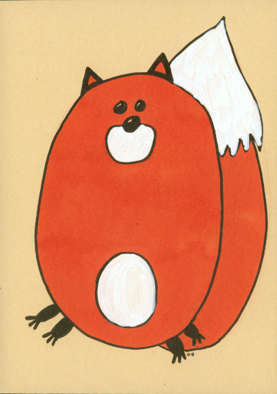 Fox November 14, 2013Doodlesanimals, brush pen, foxgog ”Not Mr. Fox, just a plain old fox” Col-erase, white-out and brush pen on cardboard 5×7