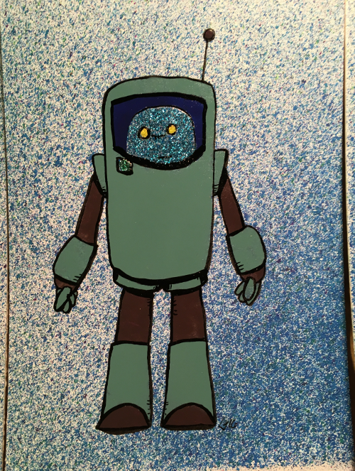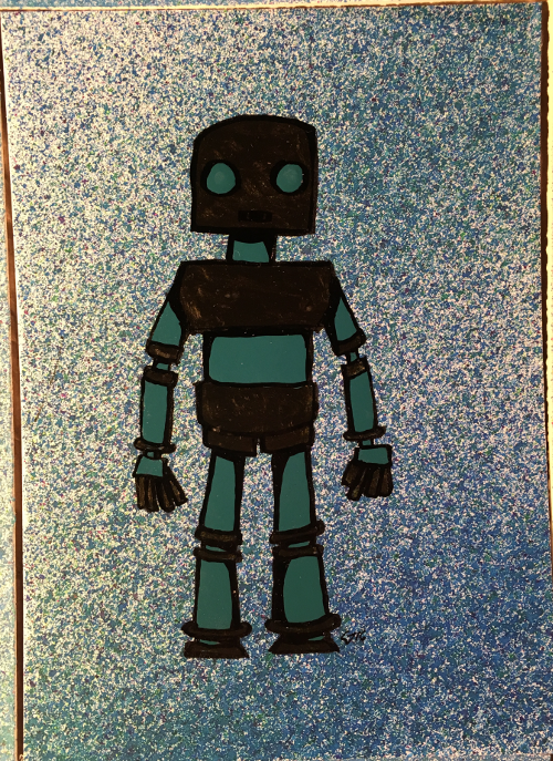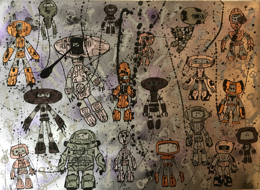 What a mess June 2, 2017Doodlesindia ink, ink spatter, keys, nail polish, robots, spray paintgog “He started it!” Spray paint, india ink & nail polish on grey cardboard 16.6×22.75