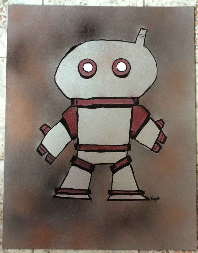 Warning, warning! August 4, 2016Doodlesindia ink, ink spatter, nail polish, robots, spray paintgog “01110111011000010111001001101110011010010110111001100111” Spray paint, india ink, ink spatter & nail polish on cardboard 11×14