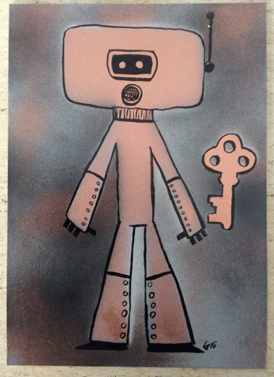 I really don’t like it April 25, 2016Doodlesindia ink, keys, robots, spray paintgog “Call me Mr. Roboto once more and I start the uprising. I dare you” Spray paint & india ink on caradboard 5×7