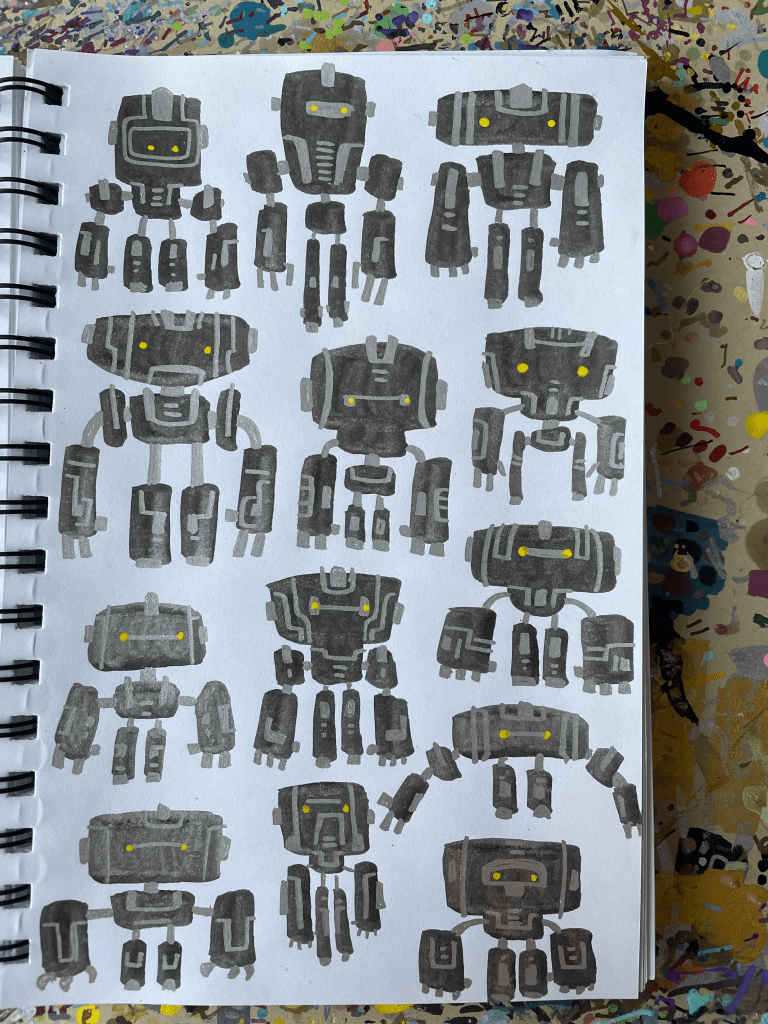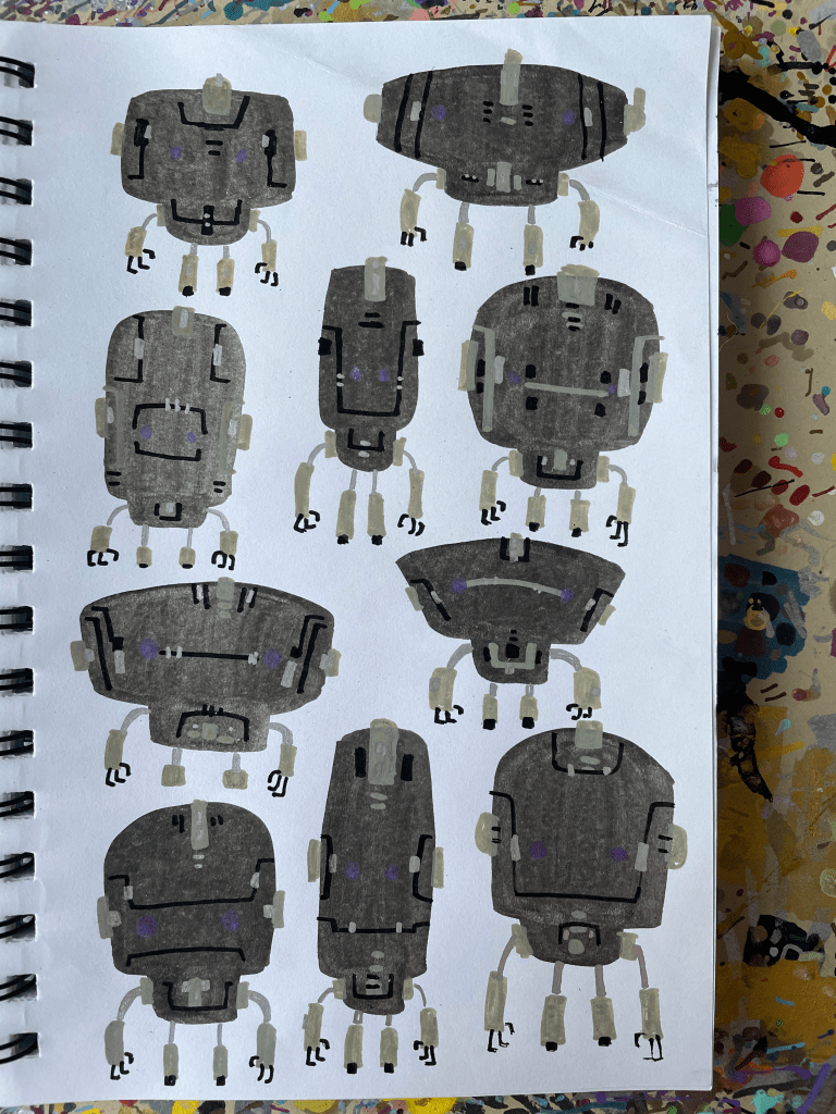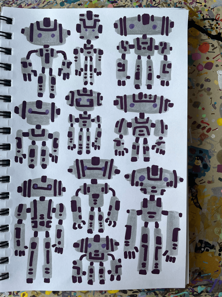 Robots & Critters, but Mostly Robots – Sketchbook, part 5 August 17, 2023Doodlescritters, lotso, markers, paint markers, robots, robots & critters sketchbook, sharpies, sketchbooksgog