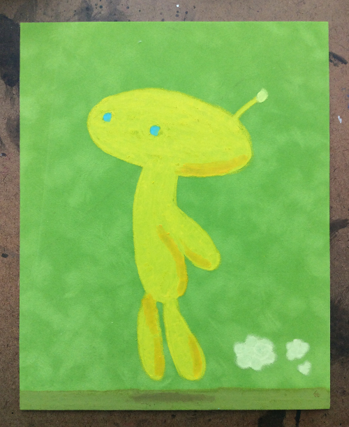 Hovering March 18, 2016Doodlesalien, monsters, oil pastelsgog “It’ sooOOoOoOOoo much better” oil pastels on green fabric covered cardboard 8×10
